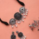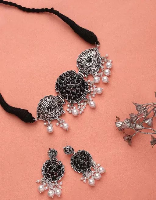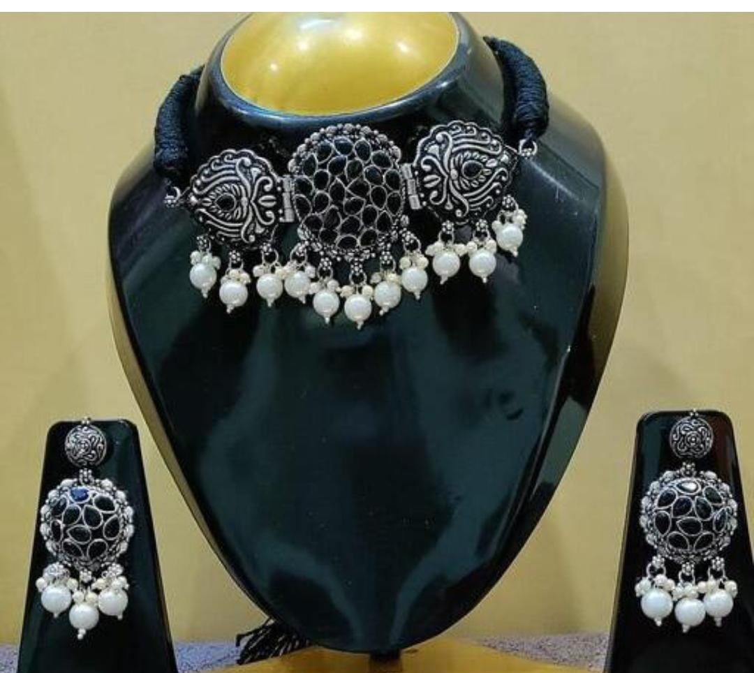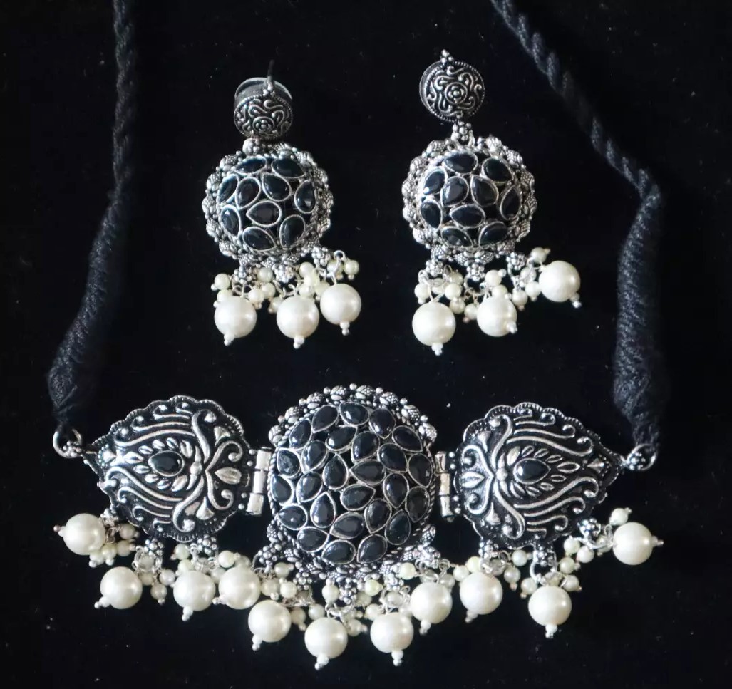 We have Oxidized Antique Jewellery Set for women’s and Girls. Beautiful Looks at One Glance – with Intricate High Polish creates Glamorous Reflections and adds Luxurious Looks. Beauty a Pair of Stylish Fancy Party Wear Choker with lovely combination. A Craftsmanship Work with detailed yet precision design on this designer German Silver Oxidized Choker. For the Indian Beauty to Ethnic Lovers, beautifully goes on all Occasion, with any outfit.