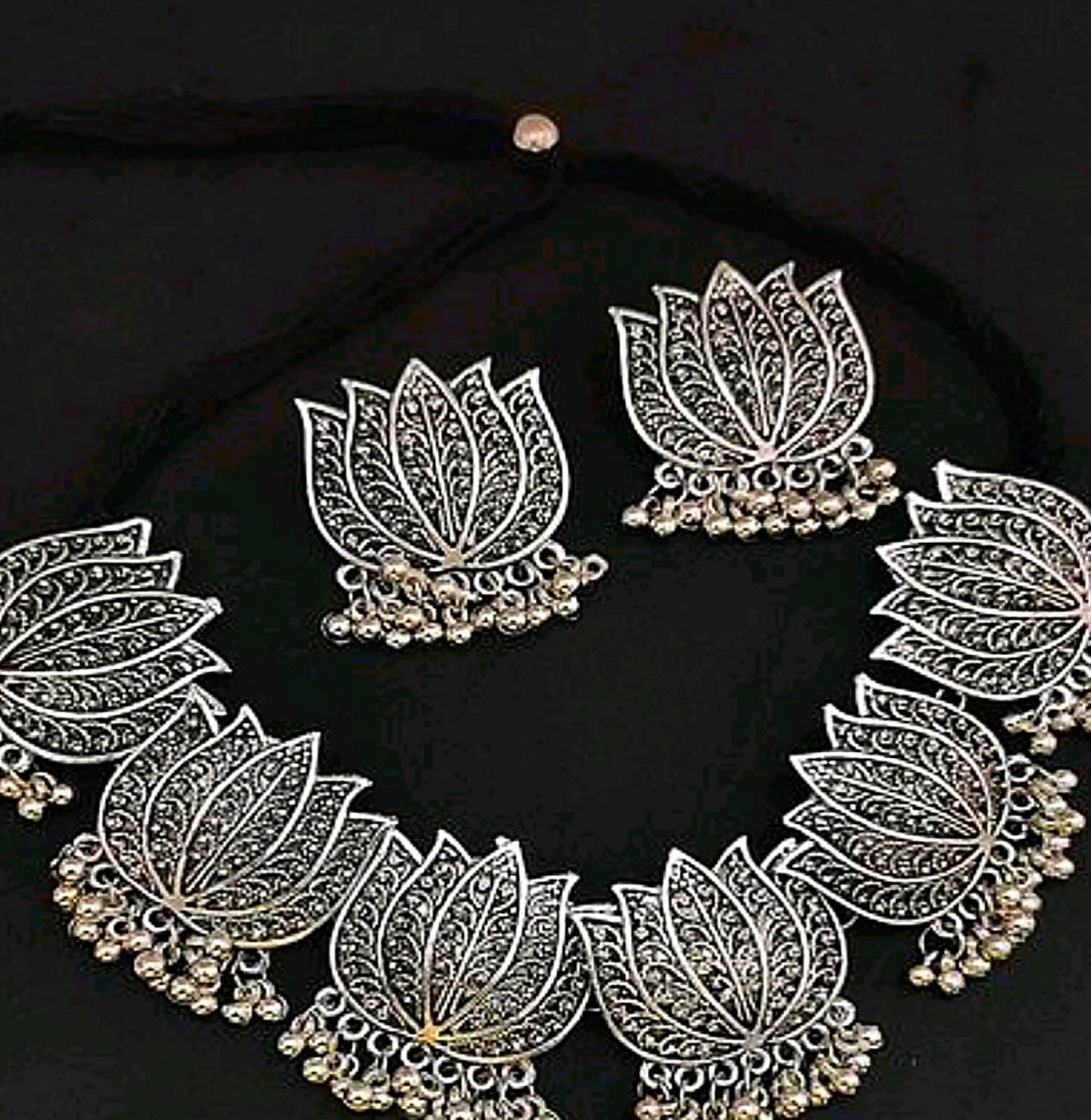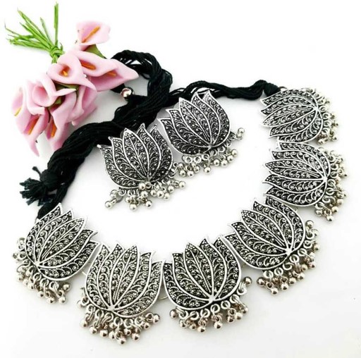 Enamorekart Oxidised Silver Lotus Design Necklace set for Women and Girls